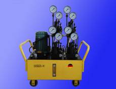 本泵站是將電能(或機(jī)械能)轉(zhuǎn)變成液壓能的裝置,為液壓機(jī)具進(jìn)行作業(yè)提供八路流量基本相同的液壓動(dòng)力源。其工作原理是:通過(guò)啟動(dòng)馬達(dá),油泵站的工作油通過(guò)溢流閥、三位四通手動(dòng)換向閥將壓力油輸出,通過(guò)裝有快換接頭的兩根高壓軟管(均可作進(jìn)出油管),與液壓機(jī)具進(jìn)行可靠的連接,通過(guò)三位四通手動(dòng)換向閥的換向來(lái)改變工作油輸出方向,實(shí)現(xiàn)液壓機(jī)具的頂升、下降或其他作業(yè)要求。